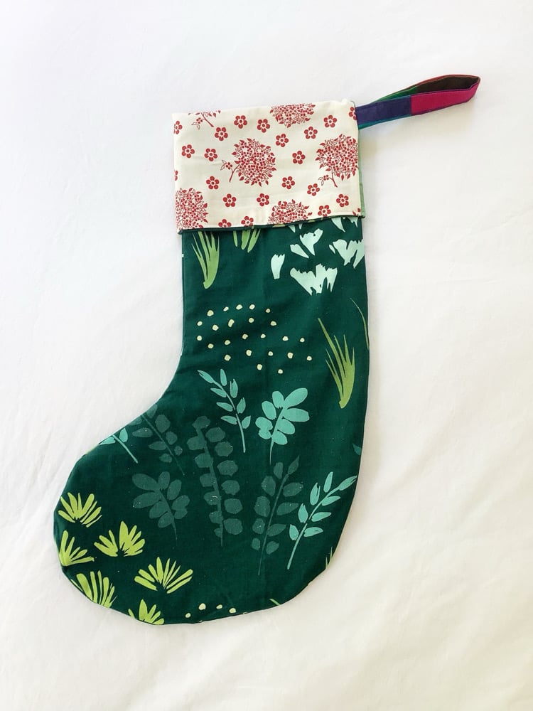Large Christmas stocking measuring 56cm long. This is a one off made from offcuts and rescued fabrics.
