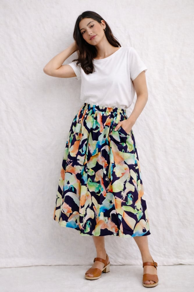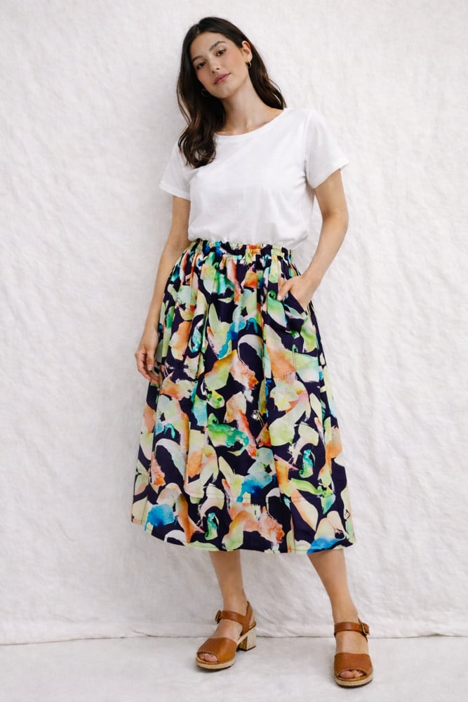 Midi length skirt with a wide soft elastic waistband and jumbo pockets with pleat detail so it has volume and doesn’t sit flat. Made from rayon fabric.
